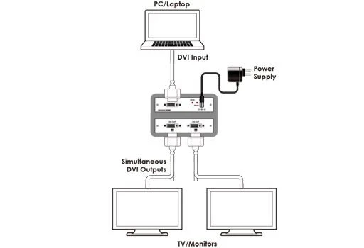 Усилитель-распределитель 1:2 сигналов DVI-D Single Link 1080p/60 (1920х1200) с HDCP и EDID на 1-м выходе, расстояние до 15 м.