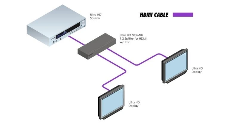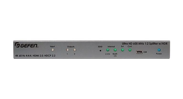 Усилитель-распределитель 1:2 сигналов HDMI 2.0 3D, 3840x2160/60, 4096x2160/60 с HDCP 1.4, 2.2 и EDID с поддержкой цветового пространства 4:4:4 и HDR. Полоса пропускания 600 МГц. Поддержка эмбеддированного аудио до 192 кГц.