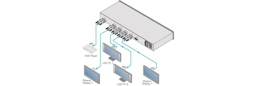 Усилитель-распределитель 1:4 сигнала DVI с поддержкой HDCP.