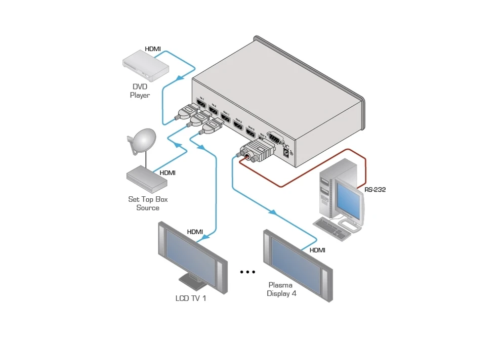 Усилитель-распределитель 1:4 сигнала HDMI с коммутатором 2x1.