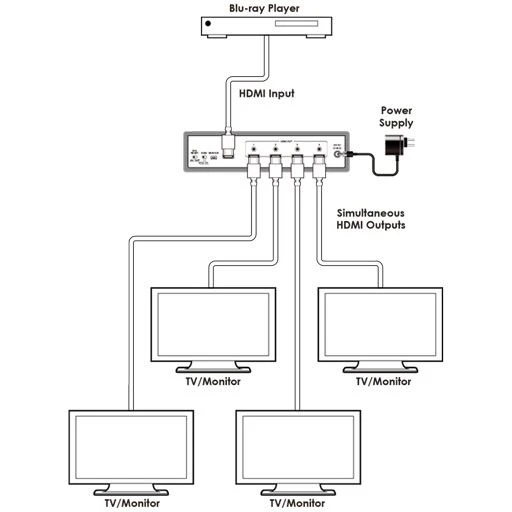 Усилитель-распределитель 1:4 сигналов HDMI 1080p/60 (3840x2160p/30, 4096x2160p/24, 3D) с EDID, расстояние до 15 м (5+10) при 4K2K.