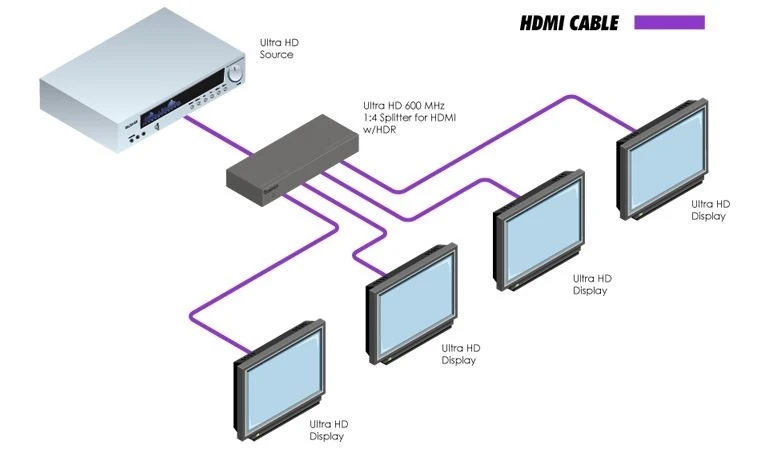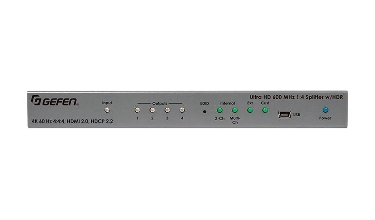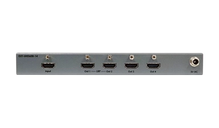 Усилитель-распределитель 1:4 сигналов HDMI 2.0 3D, 3840x2160/60, 4096x2160/60 с HDCP 1.4, 2.2 и EDID с поддержкой цветового пространства 4:4:4 и HDR. Полоса пропускания 600 МГц. Поддержка эмбеддированного аудио до 192 кГц.