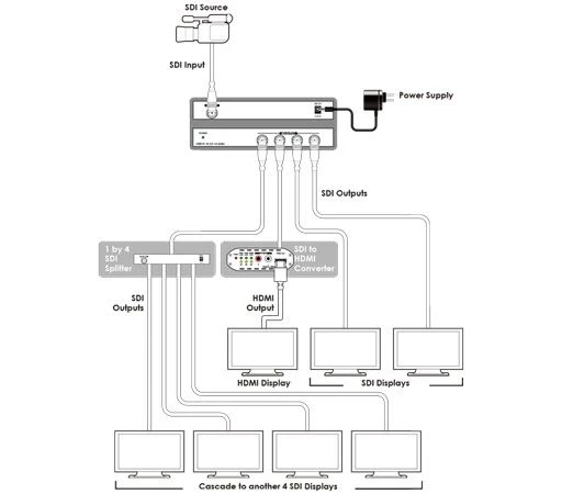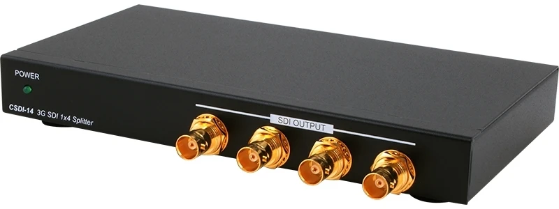 Усилитель-распределитель 1:4 сигналов SD/HD/3G-SDI (BNC) с эквалайзером и перетактированием, расстояние до 300 м (SD-SDI), 200 м (HD-SDI), 100 м (3G-SDI).