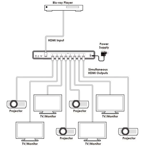 Усилитель-распределитель 1:8 сигналов HDMI 1080p/60 (3840x2160p/30, 4096x2160p/24, 3D) с EDID, расстояние до 15 м (5+10) при 4K2K.