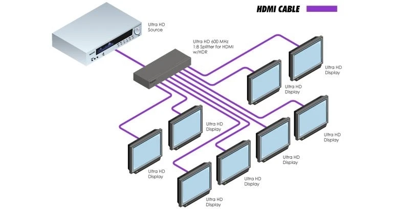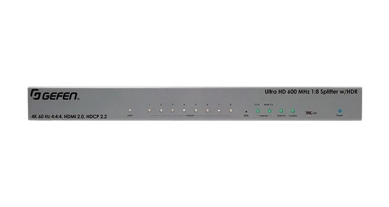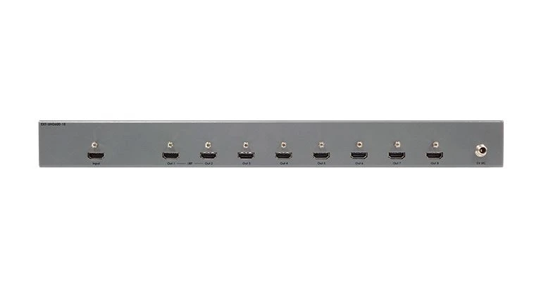 Усилитель-распределитель 1:8 сигналов HDMI 2.0 3D, 3840x2160/60, 4096x2160/60 с HDCP 1.4, 2.2 и EDID с поддержкой цветового пространства 4:4:4 и HDR. Полоса пропускания 600 МГц. Поддержка эмбеддированного аудио до 192 кГц.