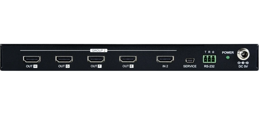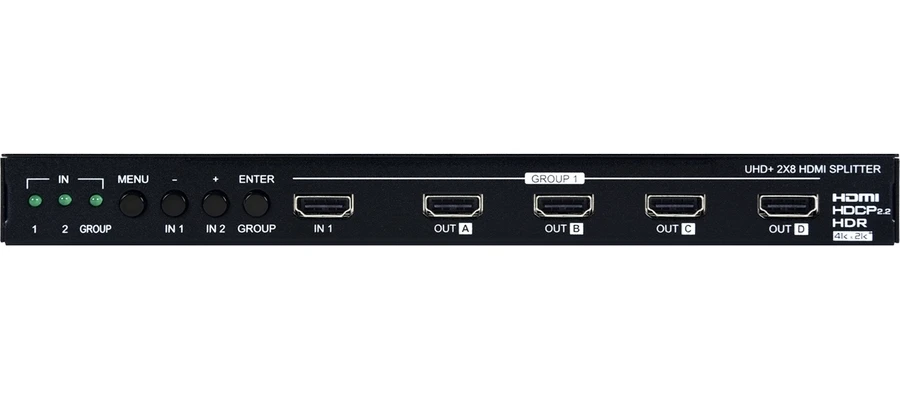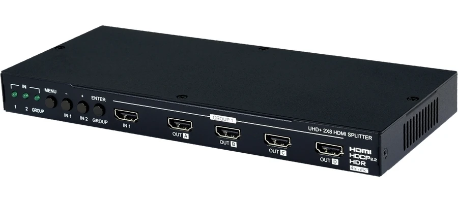 Усилитель-распределитель 2:8 (2х1:4) сигналов HDMI 3D, 4096x2160/60 (4:4:4) с HDCP 1.4, 2.2, HDR, CEC и редактором EDID, расстояние передачи сигнала 4K – до 5 м. Полоса пропускания 600 МГц. Поддержка эмбеддированного аудио до 192 кГц. Управление по RS-232.