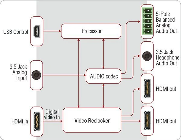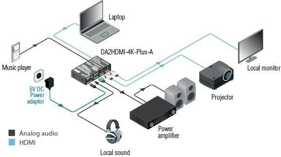Усилитель-распределитель DA2HDMI-4K-Plus-A позволяет также встраивать звуковые сигналы и извлекать PCM аудио потоки. Устройство оснащено аудио портом 3.5 jack и аудио выходом Phoenix. Модуль также оснащен аудио выходом 3.5 jack для подключения наушников.