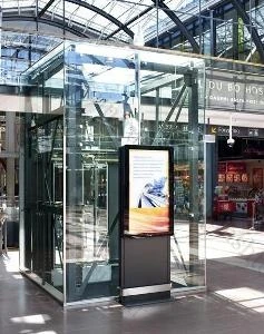 Стойка антивандальная для установки ЖК - дисплеев SMS Media Cabinet Indoor Totem разработана для монтажа рекламных систем Digital Signage внутри помещений или в любом месте, где нужно показать рекламу или другую важную информацию большому количеству посетителей. Допускается также установка SMS Media Cabinet Indoor Totem на улице, но при этом необходимо, чтобы дисплеи, используемые в ней, были предназначены для работы на улице. В SMS Media Cabinet Indoor Totem за прочным стеклом Hammerglass можно легко разместить один или два дисплея с размером экрана до 55 дюймов. Заметим, что стекло Hammerglass представляет собой лист поликарбоната (его прочность примерно в 30 раз превышает прочность стекла), который нельзя разбить или поцарапать. При этом поликарбонат устойчив к различным агрессивным химическим средам, а также к воздействию ультрафиолетового излучения. Даже при длительном облучении потоком ультрафиолетовых лучей покрытие Hammerglass не помутнеет и не потеряет прочности. Для защиты системы от несанкционированного проникновения или взлома корпус SMS Media Cabinet Indoor Totem запирается на встроенные замки. Они надежно защищают установленную внутри корпуса аппаратуру от вандалов, а конструкция замков устойчива к взлому и высверливанию. Дополнительную защиту конструкции с аппаратурой от взлома обеспечивает внешний стальной кожух черного или белого цвета. Специальное покрытие делает незаметными любые пятна или царапины на нем. Дисплеи внутри SMS Media Cabinet Indoor Totem размещаются задними стенками друг к другу. Крепление дисплеев внутри стойки осуществляется при помощи стандартных VESA отверстий. Конвекционный воздушный поток внутри конструкции осуществляет пассивное охлаждение дисплеев. Если в стойке смонтированы два ЖК-дисплея со светодиодной подсветкой и яркостью 500 кд/м2 каждый, то температура внутри нее не будет превышать температуру снаружи более чем на 10 градусов.