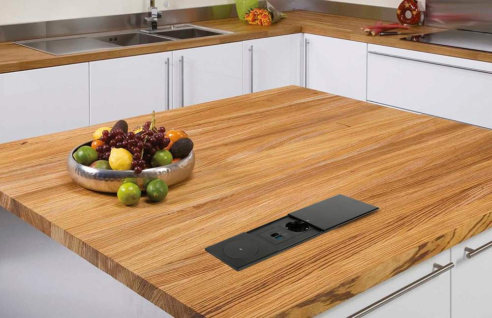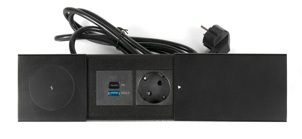 Versapad — это компактный блок розеток, включающий 1 силовую розетку с заземлением, 1 USB-зарядку 5V type A и порт RG45 папа-мама. Розетка оснащена раздвижными крышками, прикрывающими ее от попадания случайных капель, а благодаря удачному наполнению она отлично подойдет для установки в любом бытовом помещении, как то кухня, гостиная, спальня, и для общественных мест, например, лаунж-баров и т.п. Очень простая установка в стандартное для компактных розеток отверстие 80 мм позволяет осуществлять подготовку столешницы в условиях производства.Versapad рассчитан на стандартный диаметр 80 мм, что позволяет предусмотреть его установку на рабочих станциях на этапе проектирования, а также производить замену имеющихся заглушек на уже функционирующих рабочих местах.
