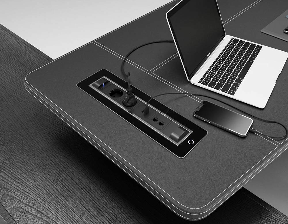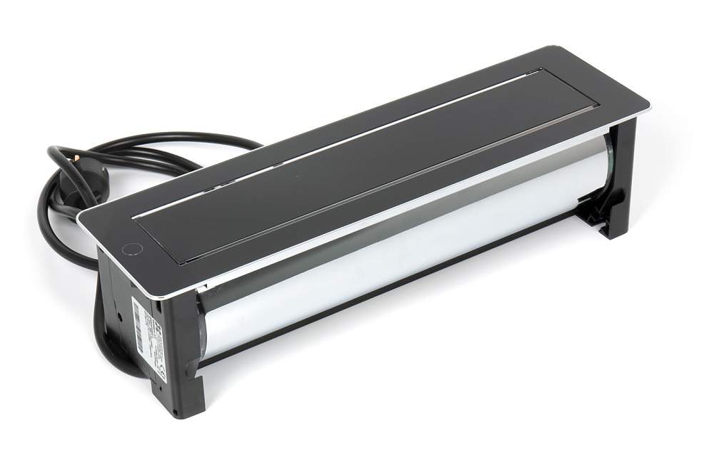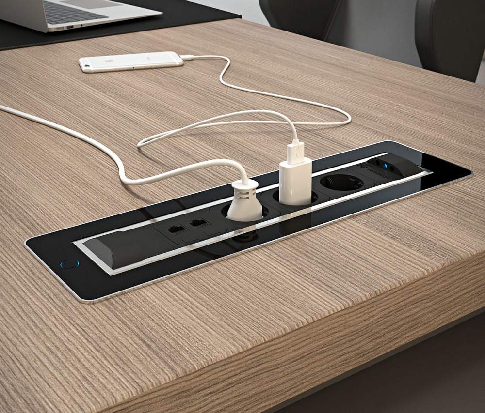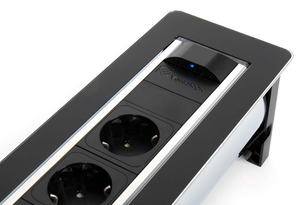 Versaturn 3.0 с отделкой из стекла и стали — сочетание футуристичного дизайна и эксплуатационной технологичности. Многофункциональный модуль разъемов электропитания и зарядных устройств оснащен электрической системой открывания/закрывания, управляемой сенсорным датчиком. Чтобы гарантировать максимальную безопасность, Versaturn 3.0 оснащен лазерной системой управления, которая предотвращает поворот устройства в закрытое положение при ниличии вилок в розетках или при обнаружении препятствия. Подходит для врезки в поверхности толщиной от 10 до 55 мм. Быстрый монтаж.