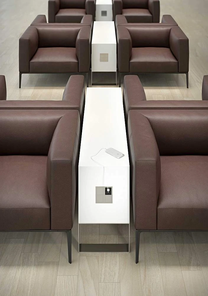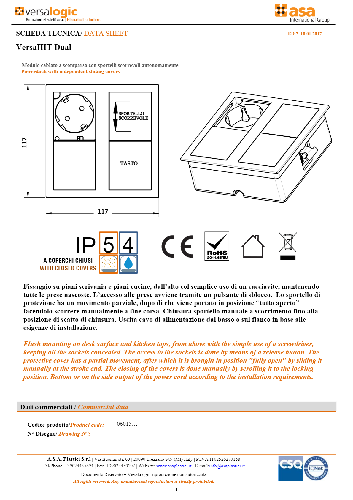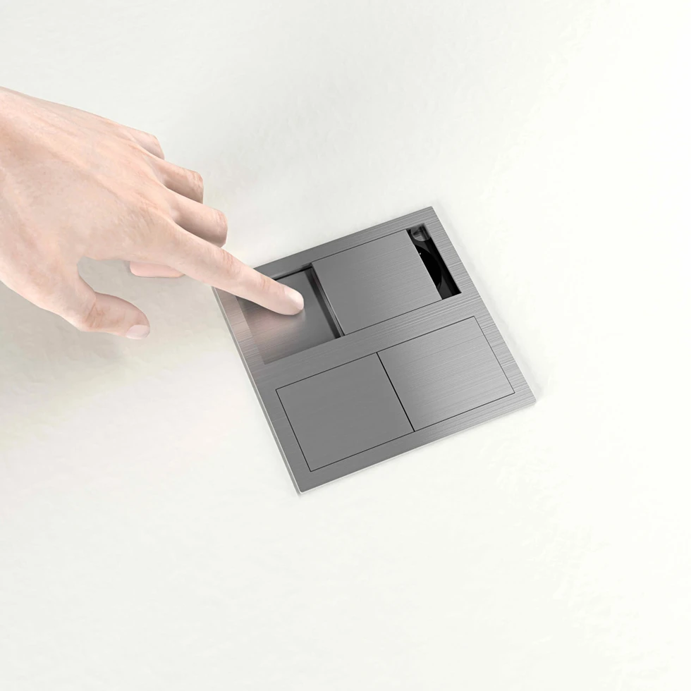 Врезная мебельная розетка с небольшой глубиной встройки, предусмотрена крышка, защищенная от случайного открывания. Толщина крышки мин. 15мм. Монтаж в вырез в панели сверху.