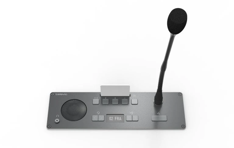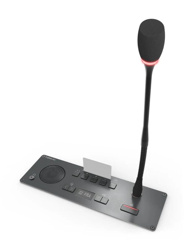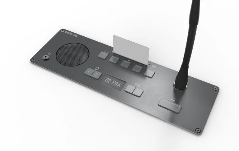 Врезной пульт делегата с 5 кнопками голосования и селектором каналов, RFID-считывателем карт и OLED-дисплеем серии Plixus Audio