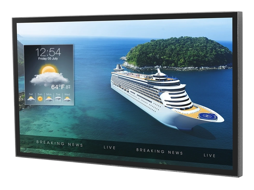 Всепогодная ЖК-панель диагональю 55'', защита IP68, 1080p, 2500 nits, VESA 400x200, 400x400 мм, защита от ИК, датчик освещенности, раб. температура -35…+60°C. Управление по IP, RS-232, ИК.