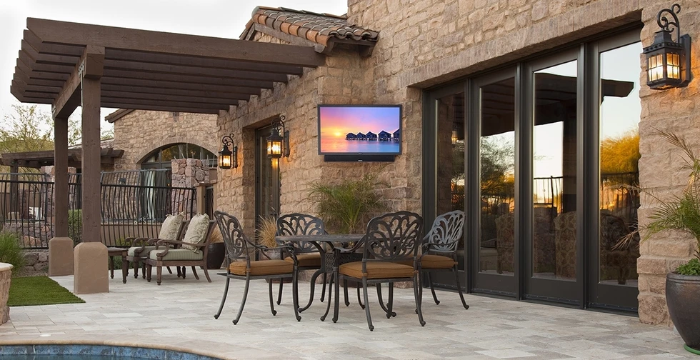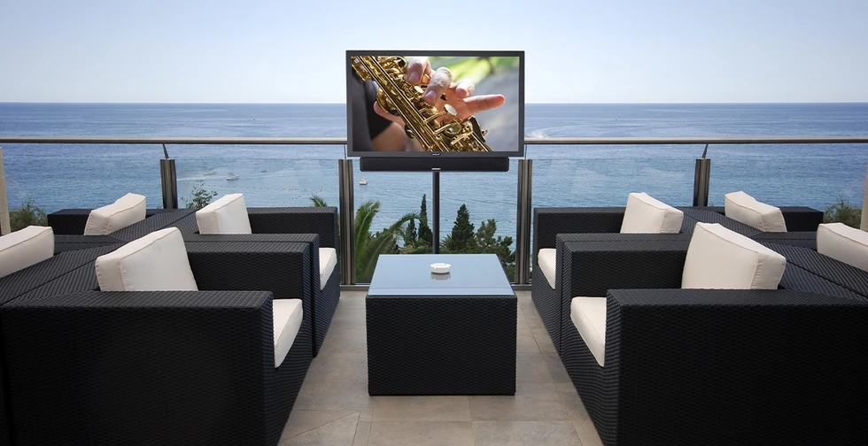 Всепогодный саундбар (IP65) для установки на стену или под ЖК-панелью от 42'' с VESA 400 мм по горизонтали, усилитель мощности 200 Вт, 105 дБ, 50 Гц – 20 кГц. Входы TOSLINK, miniJack 3,5 мм, Bluetooth (до 10 м). Управление по ИК.