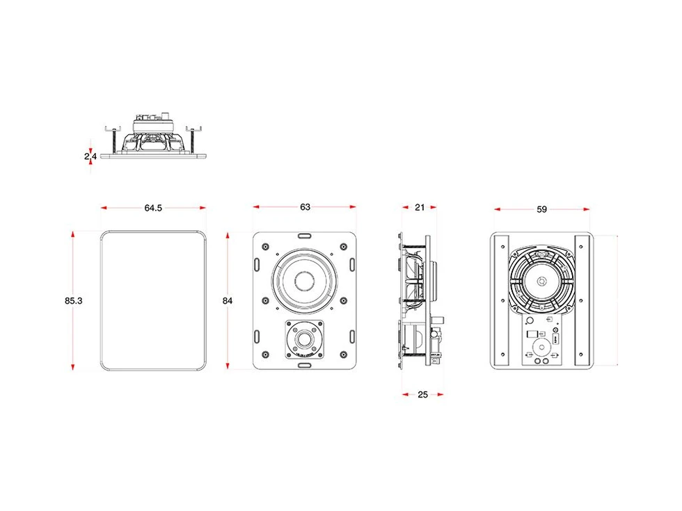 Встраиваемая двухполосная АС. 1-дюймовый мягкокупольный твитер. 6,5-дюймовый СЧ/НЧ полипропиленовый драйвер. Диапазон частот 80 Гц - 20 кГц. Рекомендуемая мощность 25-300Вт. Чувствительность 91дБ, 2.83V1m. Сопротивление 4 ома. Размеры  (ШхВхГ): 232х309х93 мм. Размер монтажного выреза (ШхВхГ): 189х273х93 мм. Вес: 4,6 кг. Металлический квадратный гриль под покраску. Цвет: Белый.