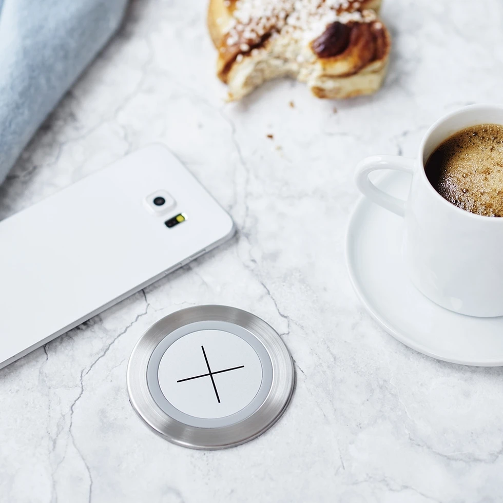 Встраиваемая беспроводная зарядная станция. Стандарт Qi 1.2. Герметичность корпуса: IP 55. Монтажное отверстие (диаметр): 60 мм. Габаритные размеры (ФxВ): 78х20 мм. Питание по USB: 5 В, 1.5 А. Адаптер для сети ~230 В в комплекте. Длина кабеля: 1,5 м. Цвет белый.