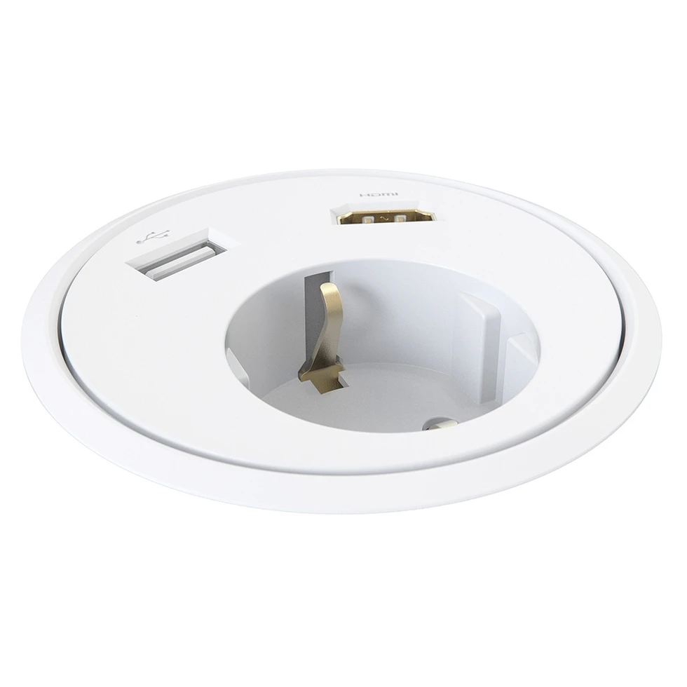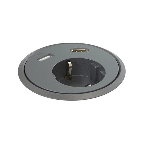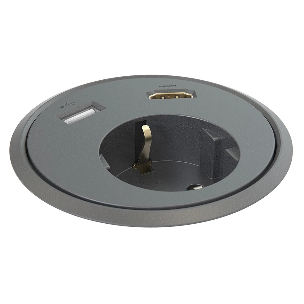 Встраиваемая розетка для монтажа в стол. Встроенные разъемы: 1xUSB, 1xHDMI. Габаритные размеры (ФxВ): 83х(89–140) мм. Монтажное отверстие (диаметр): 79 мм. Длина кабеля питания: 1,25 м. Цвет черный.