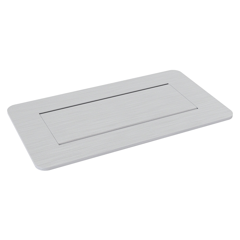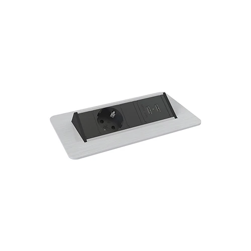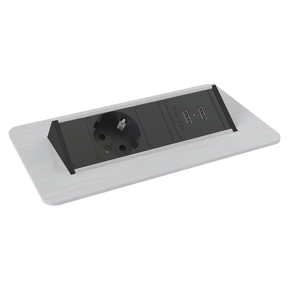 Встраиваемая розеточная станция Axessline с 1 розеткой и 2xUSB (5 В, 2.4 А). Открывается нажатием на крышку. Габаритные размеры (ШxГxВ): 231,9х111,6х91,4 мм. Монтаж к столу: врезной. Максимальная толщина столешницы: 55 мм. Монтажное отверстие: 192x92 мм. Напряжение: 250 В. Сила тока: 16 А. Длина кабеля питания: 1,5 м. Цвет серебристый.