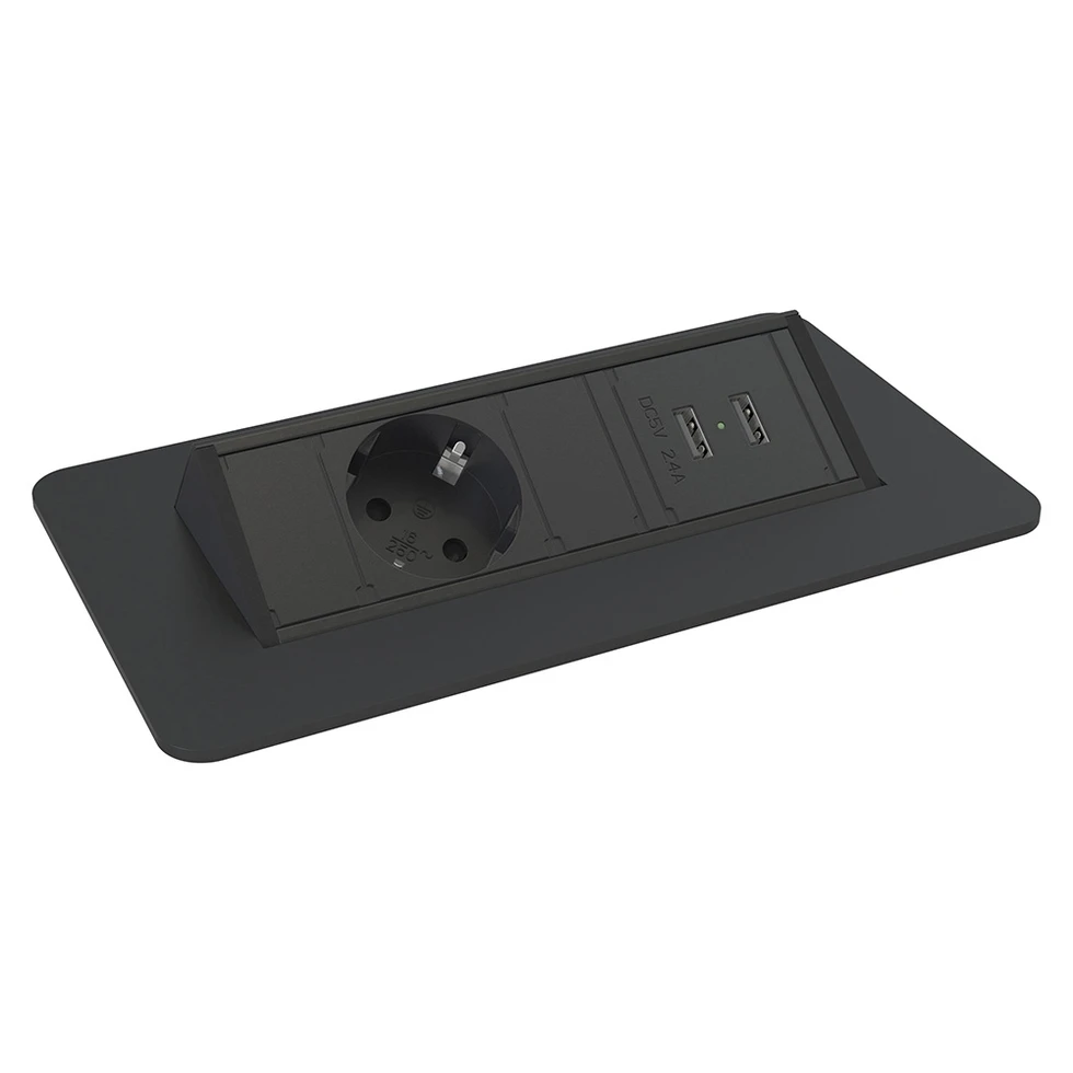 Встраиваемая розеточная станция Axessline с 1 розеткой и 2xUSB (5 В, 2.4 А). Открывается нажатием на крышку. Габаритные размеры (ШxГxВ): 231,9х111,6х91,4 мм. Монтаж к столу: врезной. Максимальная толщина столешницы: 55 мм. Монтажное отверстие: 192x92 мм. Напряжение: 250 В. Сила тока: 16 А. Длина кабеля питания: 1,5 м. Цвет черный.