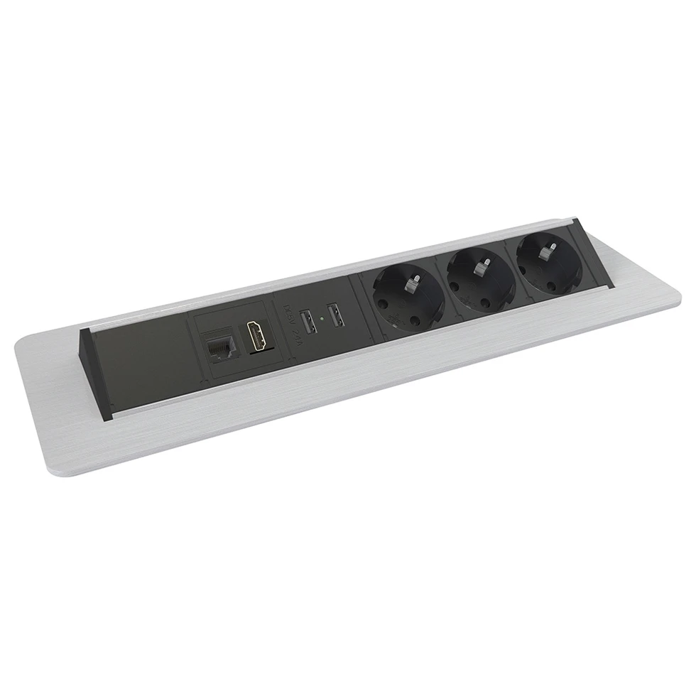 Встраиваемая розеточная станция Axessline с 3 розетками, 1хRJ45, 1хHDM и 2xUSB. Открывается нажатием на крышку. Габаритные размеры (ШxГxВ): 360,9х111,6х91,4 мм. Монтаж к столу: врезной. Максимальная толщина столешницы: 55 мм. Монтажное отверстие: 322x92 мм. Напряжение: 250 В. Сила тока: 16 А. Длина кабеля питания: 1,5 м. Цвет серебристый.