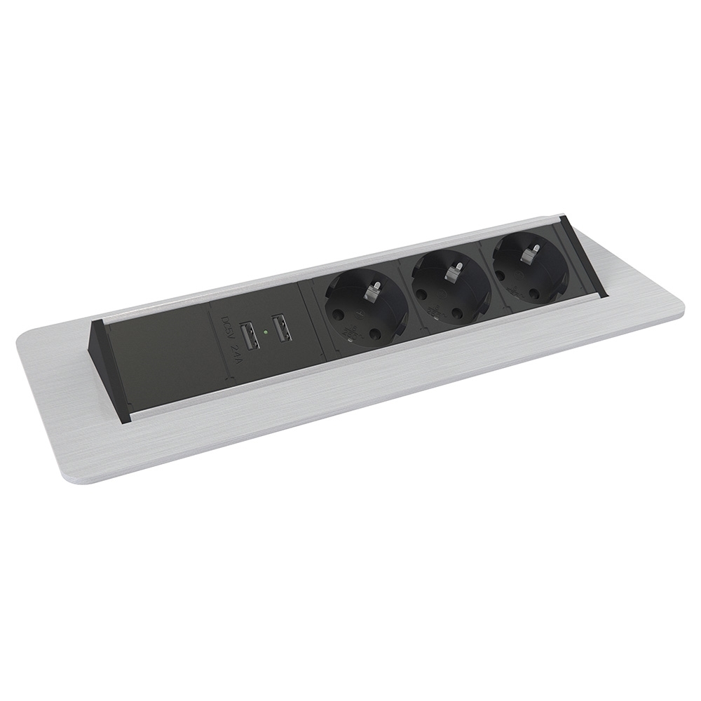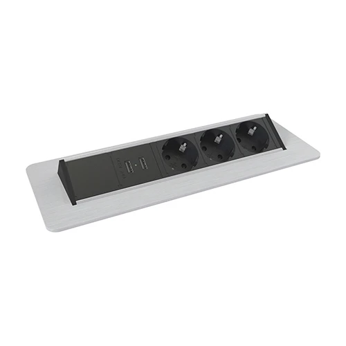 Встраиваемая розеточная станция Axessline с 3 розетками и 2xUSB (5 В, 2.1 А макс). Открывается нажатием на крышку. Габаритные размеры (ШxГxВ): 317,9х111,6х91,4 мм. Монтаж к столу: врезной. Максимальная толщина столешницы: 55 мм. Монтажное отверстие: 278x92 мм. Напряжение: 250 В. Сила тока: 16 А. Длина кабеля питания: 1,5 м. Цвет серебристый.