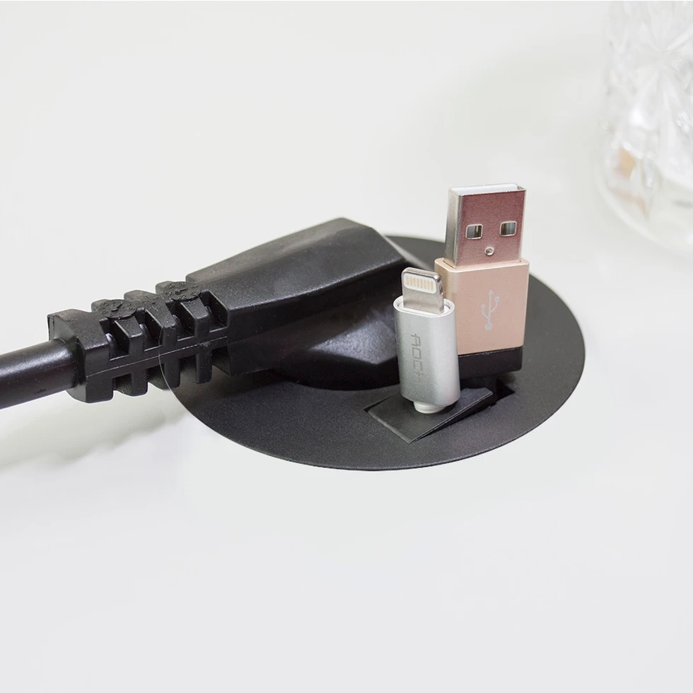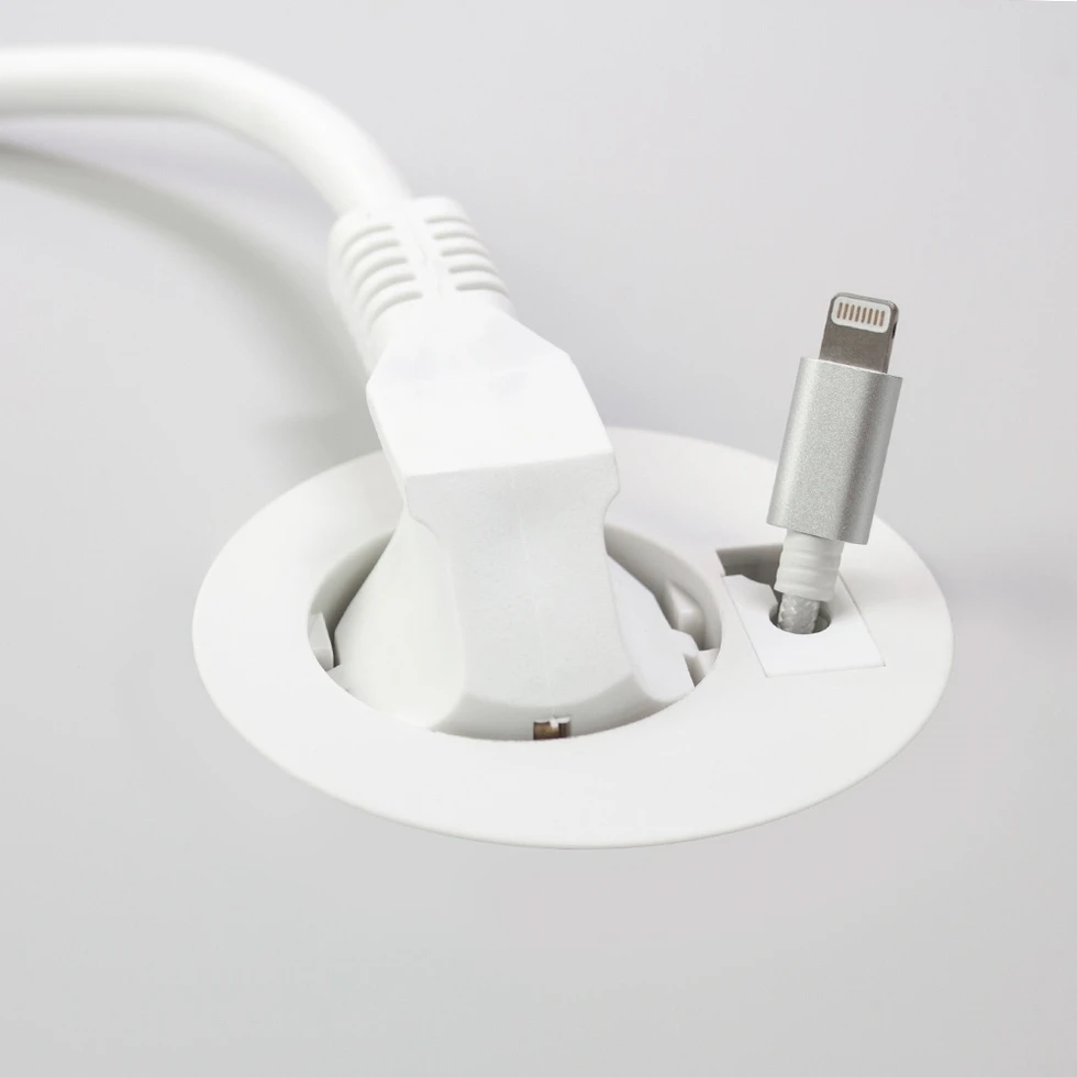 Встраиваемая зарядная станция Powerdot MINI с отверстием для кабелей 10x20 мм. Габаритные размеры (ФxВ): 71,4х82 мм. Монтажное отверстие (диаметр): 60 мм. Максимальная толщина столешницы: 52 мм. Длина кабеля питания: 1,55 м. Цвет черный.