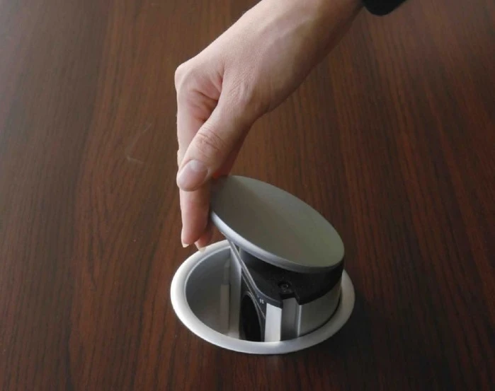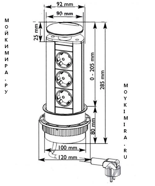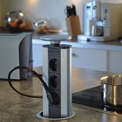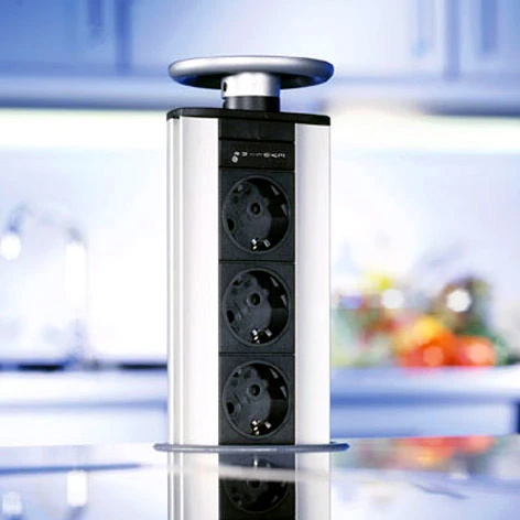 Выдвижная розетка Evoline Port Standart 931.00.001 с крышкой из пластика (3 розетки) цвет серебристый. Встраиваемую розетку можно установить не только на кухне, но и в кабинете, в офисе, на рабочем столе школьника или студента. Встраиваемая выдвижная розетка оснащена кабелем 3 метра с заземлением. Розетку можно установить в верхние шкафы (при установке на кухне) с максимальной толщиной 50 мм. При установке самостоятельно без помощи специалистов Вам необходимо будет фрезой сделать монтажное отверстие диаметром 102 мм, глубина сверления должна быть до 45 мм. Для того чтобы воспользоваться встроенной выдвижной розеткой необходимо нажать на углубление на крышке и потянуть ее, тем самым Вы вытянете розетку, подключить вилку оборудования которое Вы собираетесь использовать и задвинуть розетку обратно в столешницу. Между крышкой и панелью остается пространство для свободного прохода кабеля.