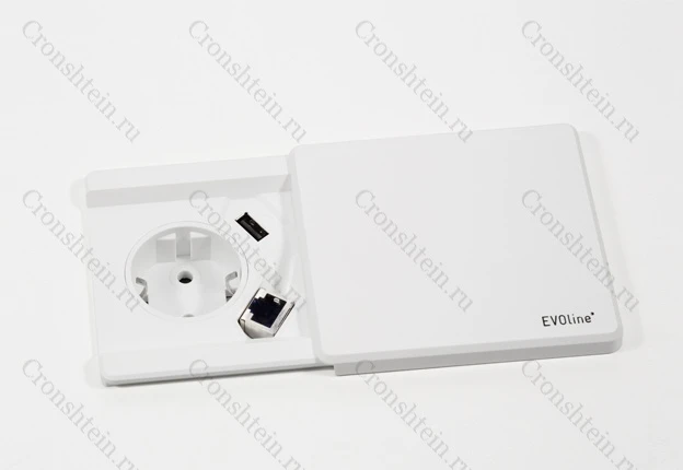 EVOline® Square80 с Qi-зарядкой 927.00.022,1 электрическая розетка с заземлением (кабель 3м), RJ45 (кабель 3м), USB зарядка. Крышка и корпус белого цвета.
