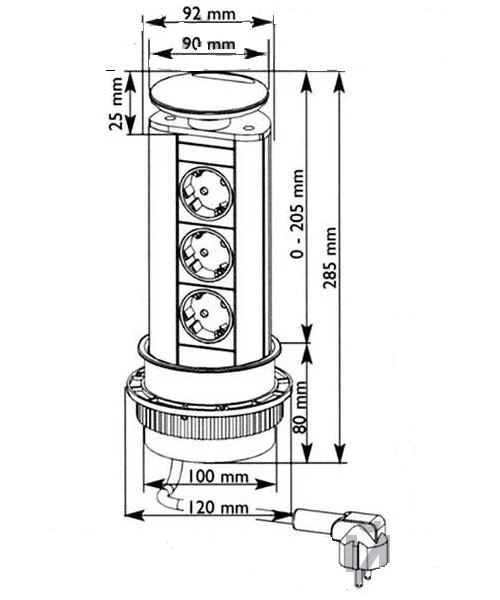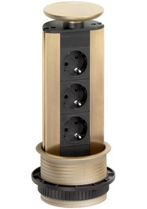 Выдвижная розетка Evoline Port Standart 931.01.157 с крышкой из пластика, цвет "античная бронза" (3 розетки) без подсветки. Встраиваемую розетку можно установить не только на кухне, но и в кабинете, в офисе, переговорной, на рабочем столе школьника или студента. Встраиваемая выдвижная розетка оснащена кабелем 2,5 метра с заземлением. Штепсельная вилка прилагается отдельно и подсоединяется к кабелю по месту. Розетку можно установить в верхние шкафы (при установке на кухне) с максимальной толщиной 50 мм. При установке самостоятельно без помощи специалистов Вам необходимо будет фрезой сделать монтажное отверстие диаметром 102 мм, глубина сверления должна быть до 45 мм. Фрезу для изготовления отверстия можно приобрести отдельно (арт. 990.90.170). Для того чтобы воспользоваться встроенной выдвижной розеткой необходимо нажать на углубление на крышке и потянуть ее, тем самым Вы вытянете розетку, подключить вилку оборудования которое Вы собираетесь использовать и задвинуть розетку обратно в столешницу. Между крышкой и панелью остается пространство для свободного прохода кабеля.