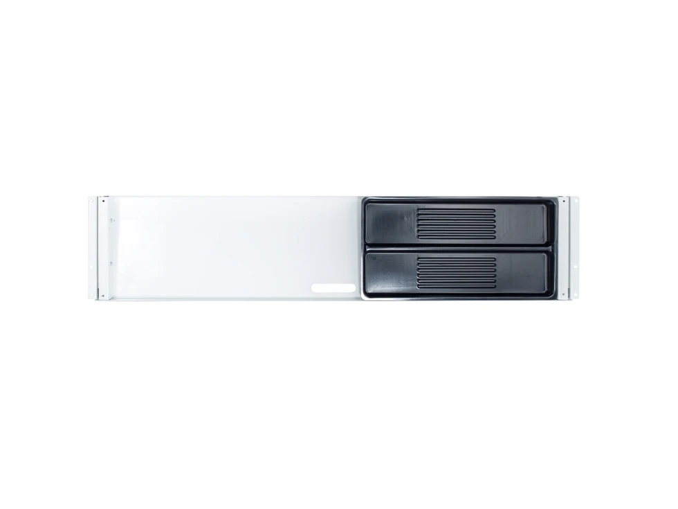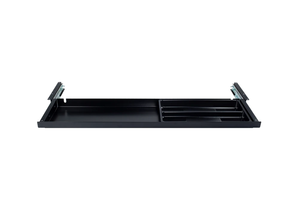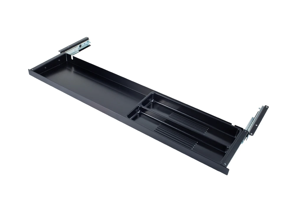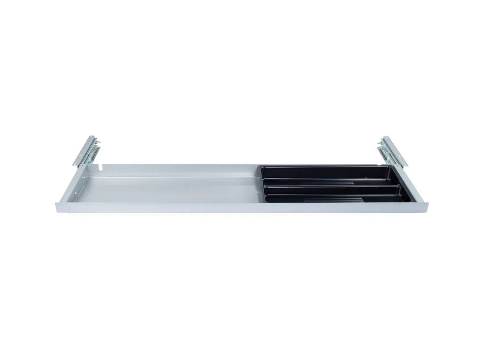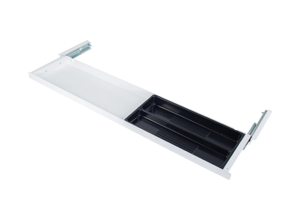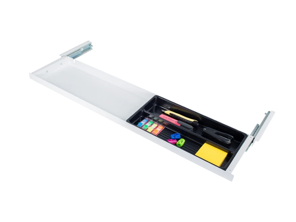 Выдвижной ящик-органайзер для канцелярских принадлежностей, большой, неглубокий. Габаритные размеры (ШxГxВ): 870x186x43 мм. 6 отделений в органайзере. Полезное пространство (ШxГxВ): 798x184x30 мм. Телескопические направляющие с плавным ходом. Монтаж: под стол. Материал: металл, пластик. Цвет белый.