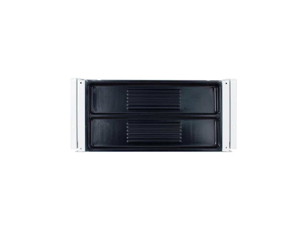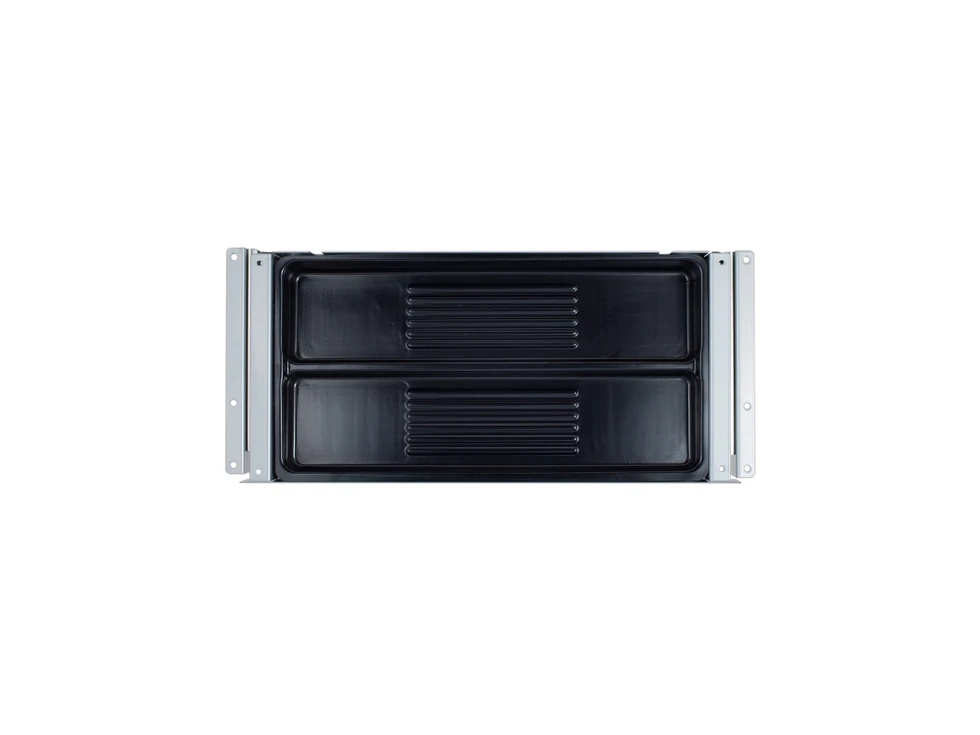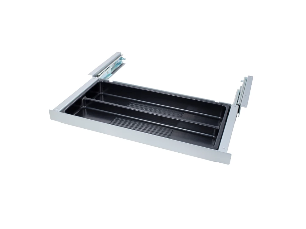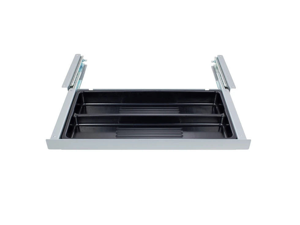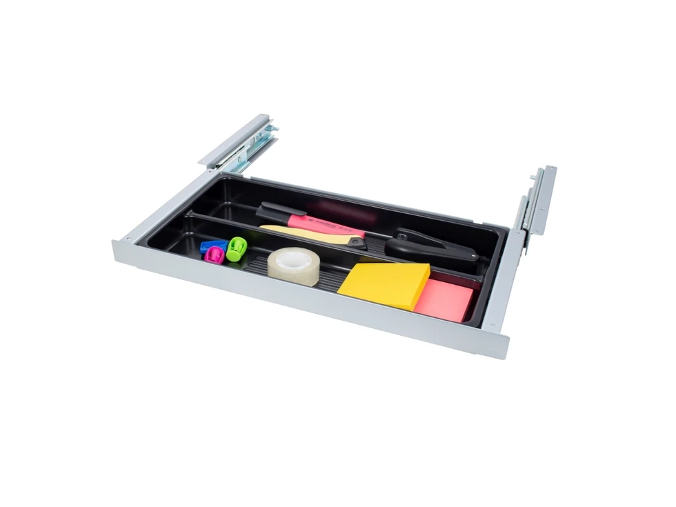 Выдвижной ящик-органайзер для канцелярских принадлежностей, малый. Габаритные размеры (ШxГxВ): 425x186x43 мм. 2 отделения. Полезное пространство (ШxГxВ): 349x184x30 мм. Телескопические направляющие с плавным ходом. Монтаж: под стол. Материал: металл, пластик. Цвет серебристый.