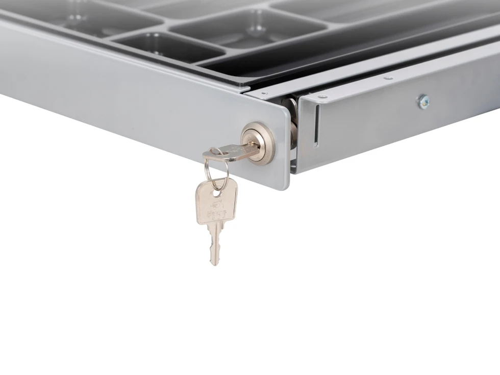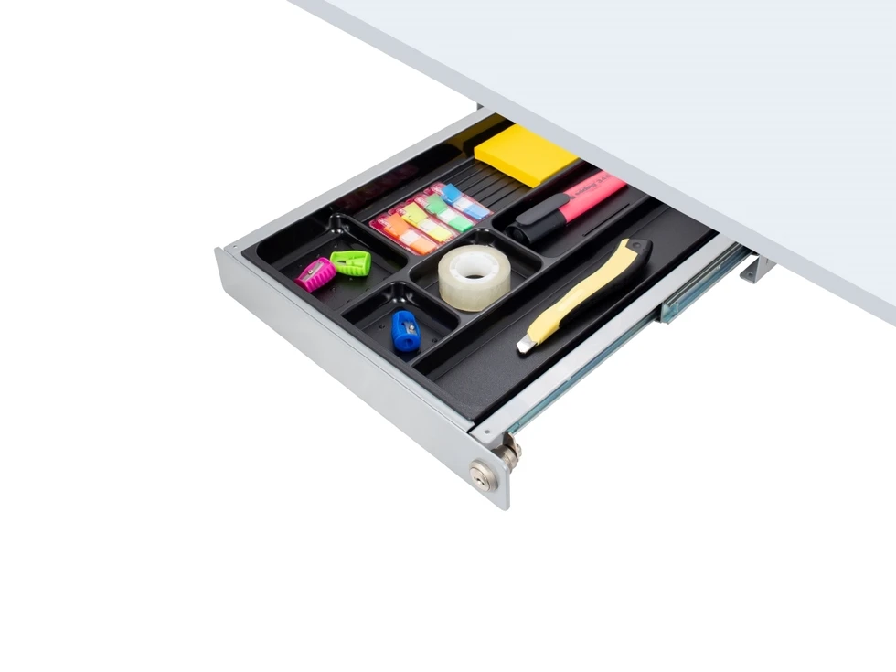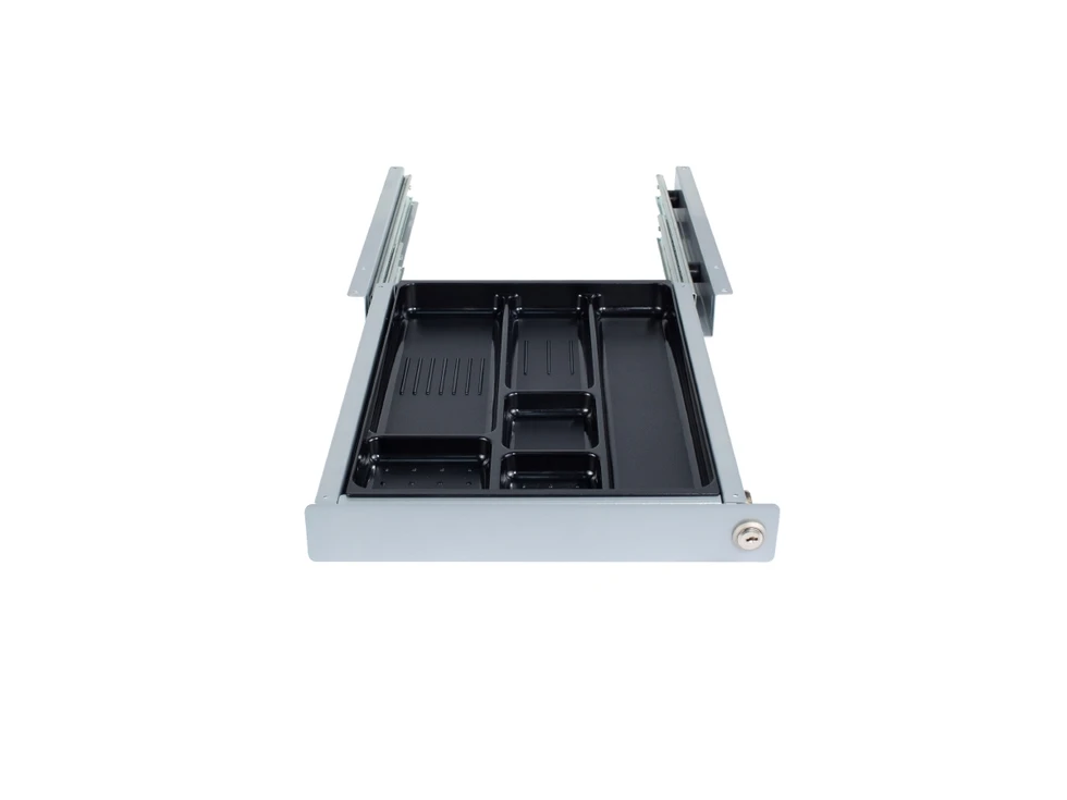 Выдвижной ящик-органайзер для канцелярских принадлежностей, средний. Поворотный замок. Габаритные размеры (ШxГxВ): 330x347,5x44,9 мм. 6 отделений. Полезное пространство (ШxГxВ): 238x325x43 мм. Телескопические направляющие с плавным ходом. Монтаж: под стол. Материал: металл, пластик. Цвет серебристый.