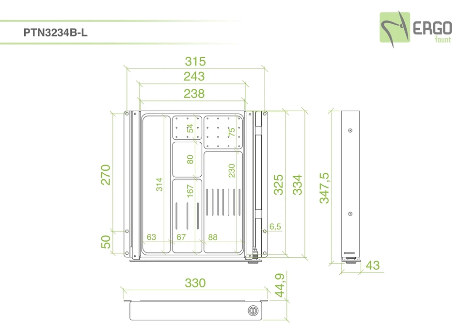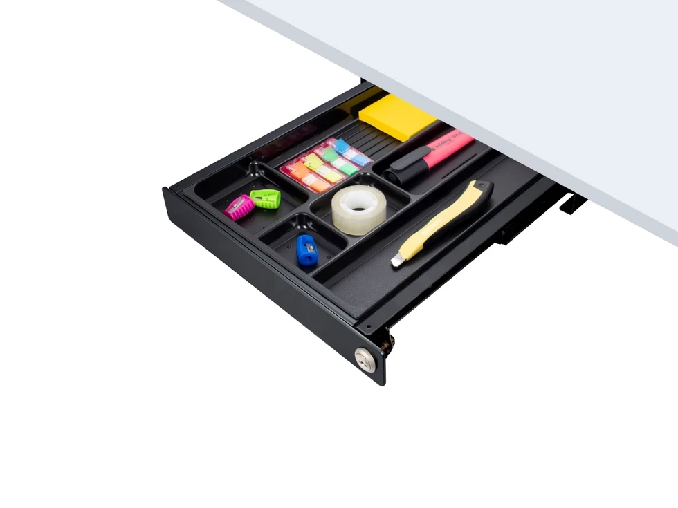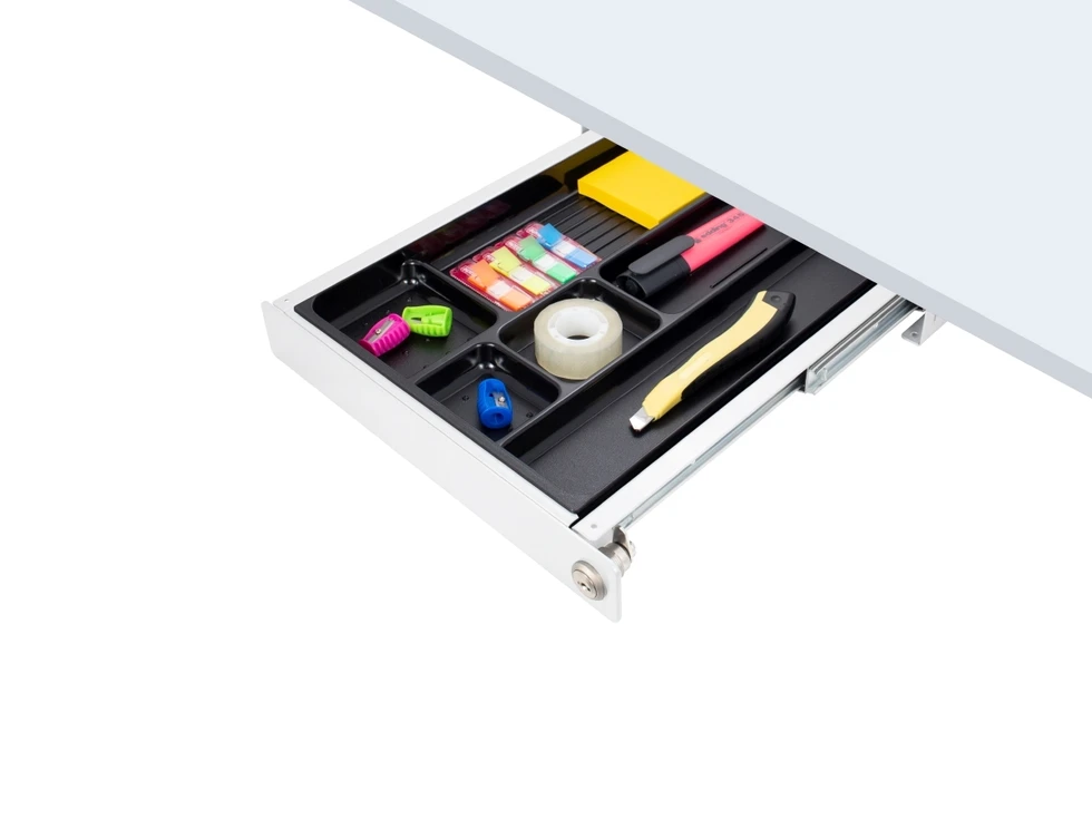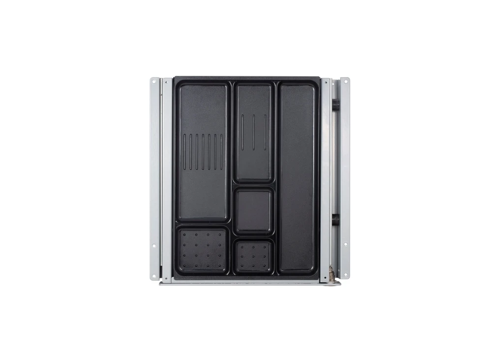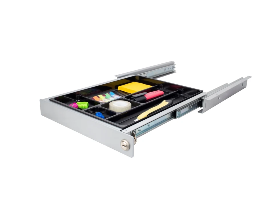 Выдвижной ящик-органайзер для канцелярских принадлежностей, средний. Поворотный замок. Габаритные размеры (ШxГxВ): 330x347,5x44,9 мм. 6 отделений. Полезное пространство (ШxГxВ): 238x325x43 мм. Телескопические направляющие с плавным ходом. Монтаж: под стол. Материал: металл, пластик. Цвет белый.