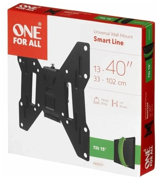 WM2221 - это наклонный кронштейн для телевизоров размером от 13 до 40 дюймов. Он предназначен для монтажа на стену и подходит для телевизоров, вес которых не превышает 50 килограмм. Кронштейн поддерживает стандарт VESA до 200 мм и предназначен для установки телевизоров серии SMART.