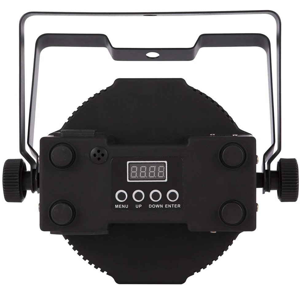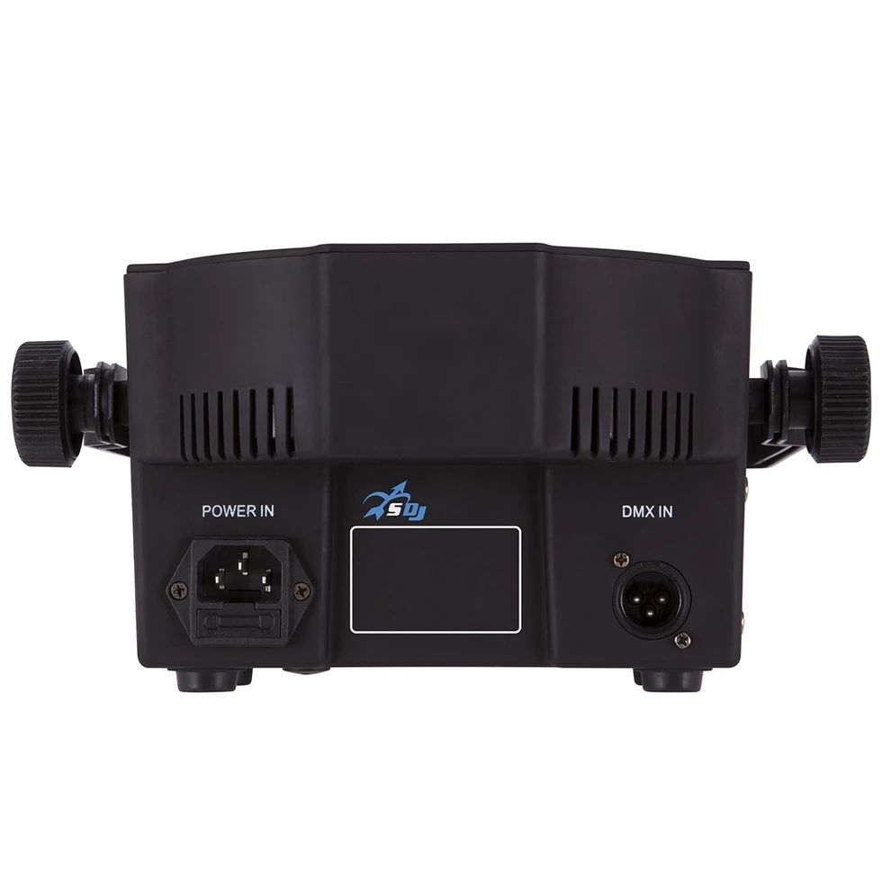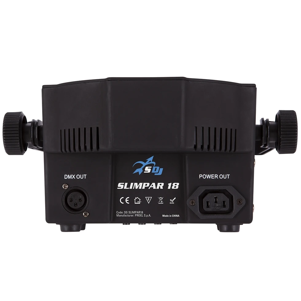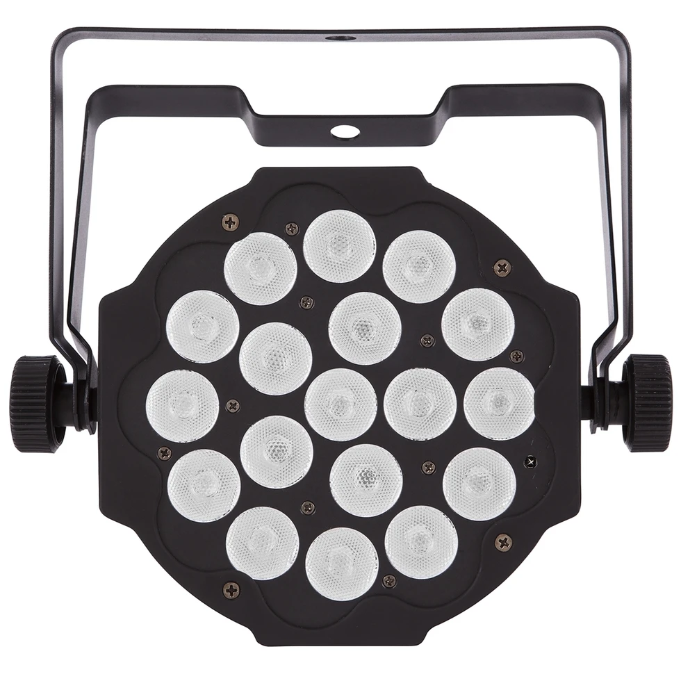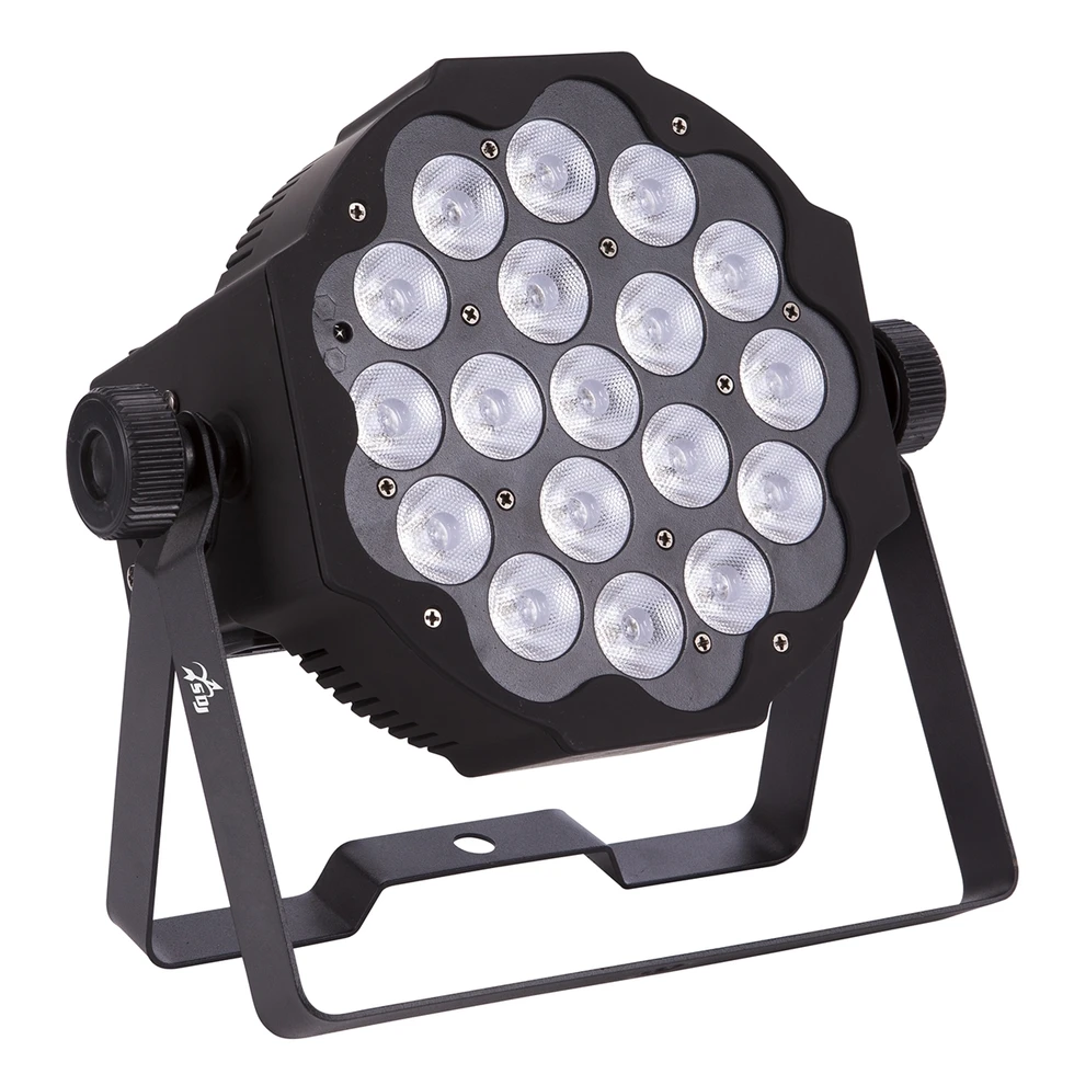 Заливающий прожектор 18 x 3 Вт RGB LED, 1140 лк / 5 м, угол луча 25°, стробоскоп до 20 вспышек/с, 1/3/4/7 DMX-каналов, ИК-пульт.
