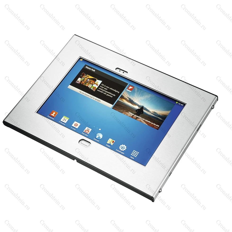 Защитный корпус для планшетных ПК Samsung Galaxy TAB3 10,1 дюйма. Стандарт VESA 100x100. Предусмотрены доступ к портам и кнопке Home, отверстие для камеры, секретный крепеж. Открывающаяся передняя крышка с замком. Цвет серебристый.